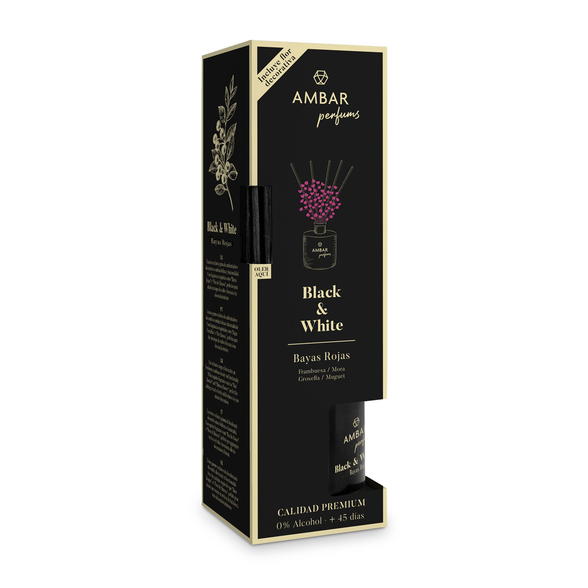 El mikado Bayas Rojas de nuestra colección Black & White te envuelve en una deliciosa mezcla de frutas rojas y flores frescas. Con notas de salida de frambuesa y mora grosella, un corazón floral de muguet y un acabado vibrante, esta fragancia aporta un toque dulce y energético a cualquier espacio. Además, su diseño elegante con flor decorativa lo convierte en el complemento ideal para realzar la decoración de tu hogar. Disfruta de más de 45 días de frescura con un mikado de 0% alcohol que cuida de ti y de tu entorno.