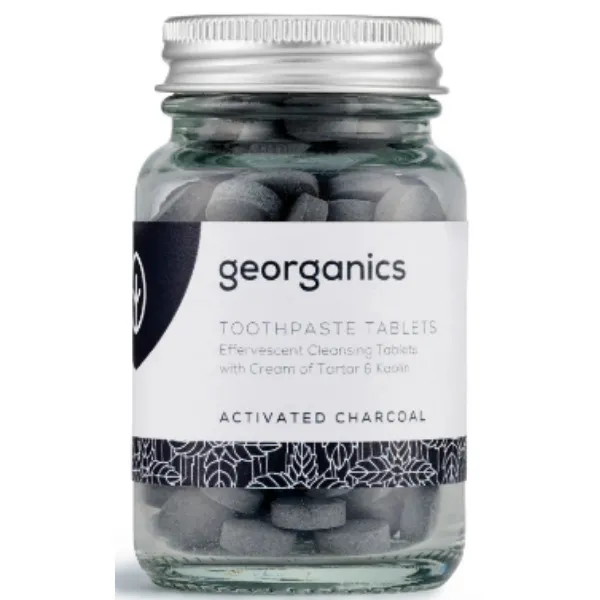 Dentífrico blanqueante en pastillas con carbón activado y aceite orgánico de menta.