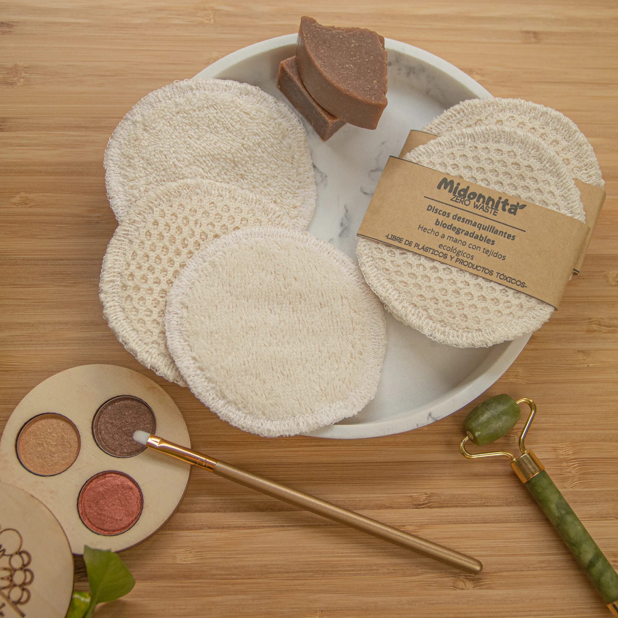 Disco desmaquillante reutilizable elaborado con algodón orgánico sin tintes.