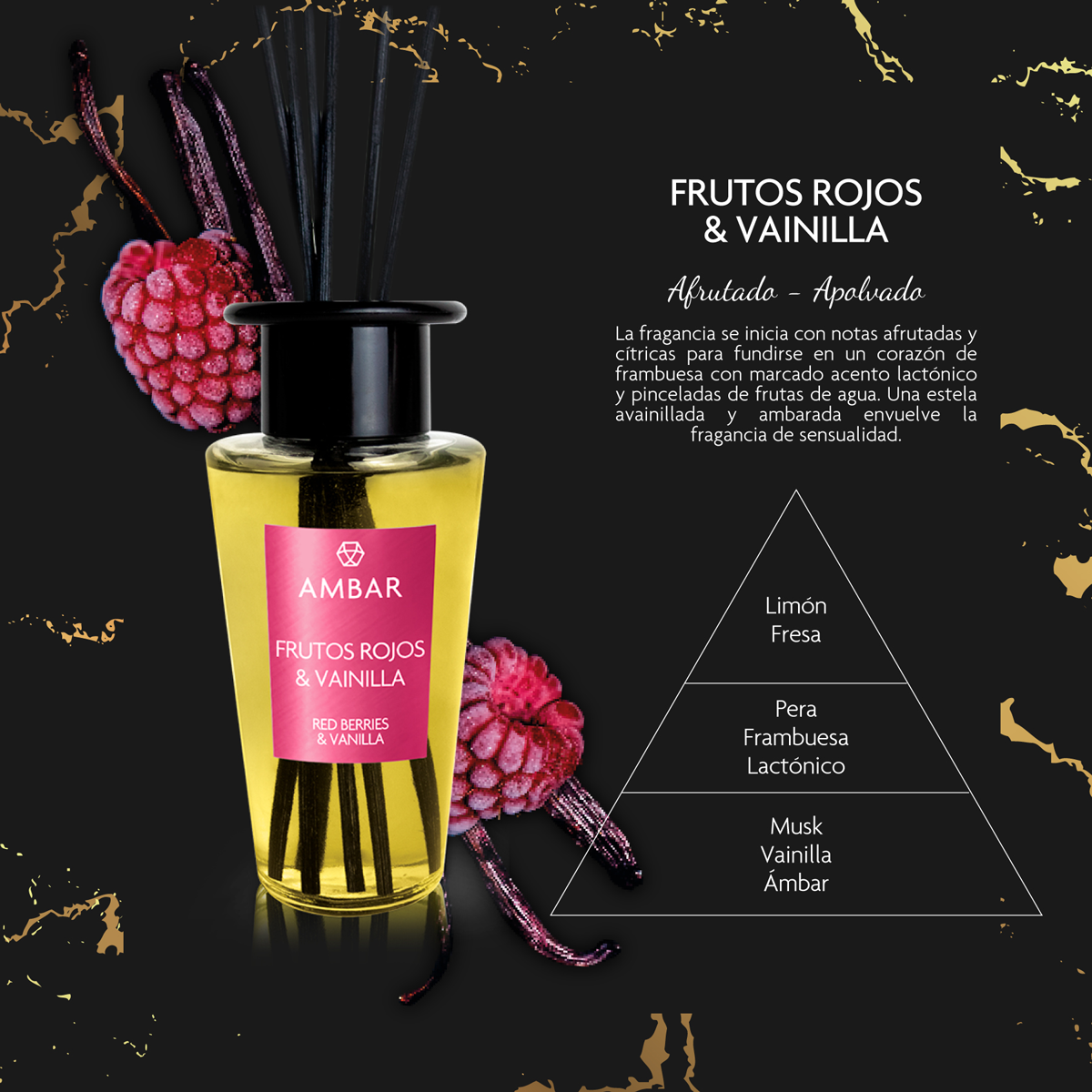 Frutos Rojos & Vainilla: La fragancia se inicia con notas afrontadas y cítricas para fundirse en un corazón de frambuesa con marcado acento lacónico y pinceladas de frutas de agua. Una estela avainillada y ambarada envuelve la fragancia de sensualidad.