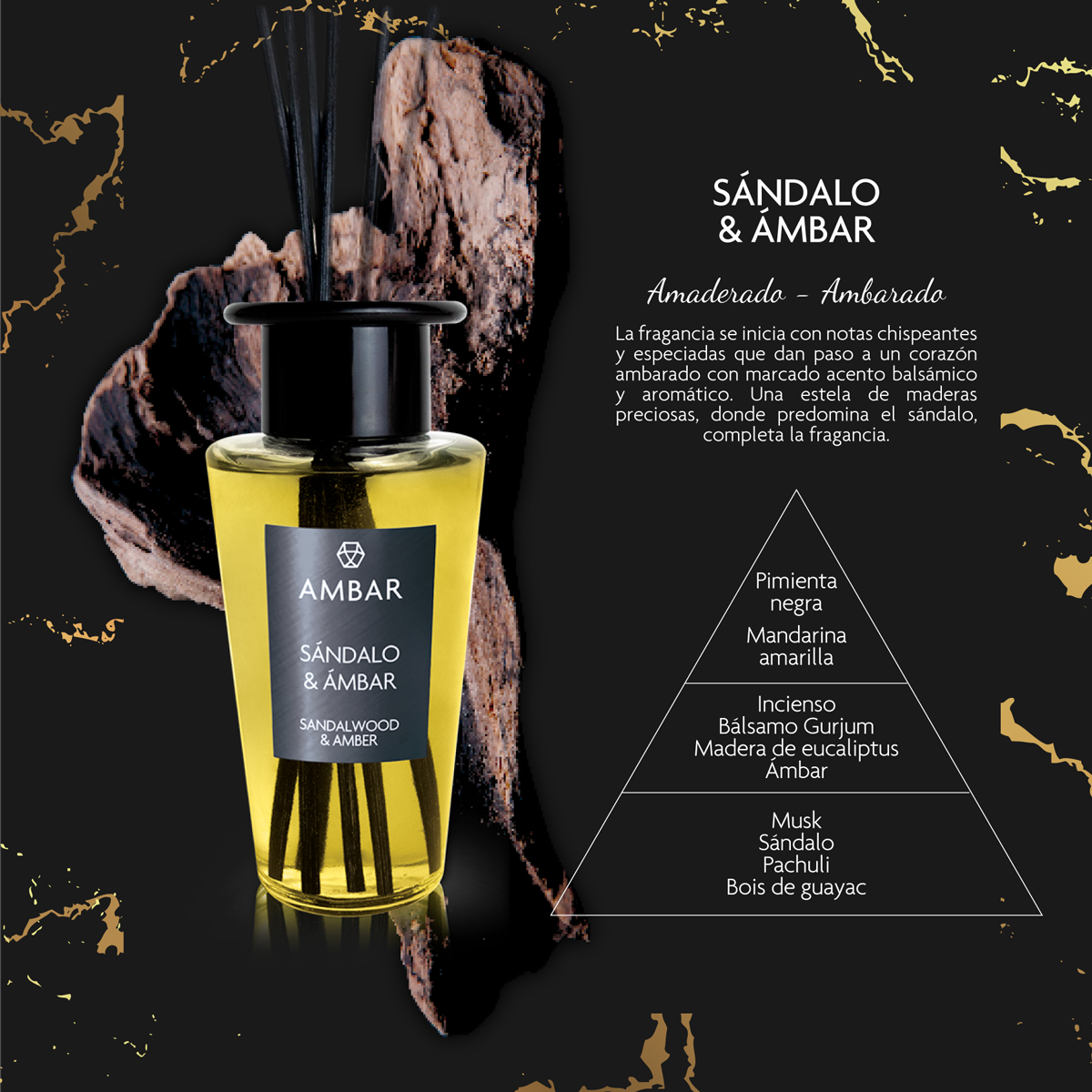 Sándalo & Ambar: La fragancia se inicia con notas chispeantes y especiadas que dan paso a un corazón ambarado con marcado acento balsámico y aromático. Una estela de maderas preciosas, donde predomina el sándalo completa la fragancia.