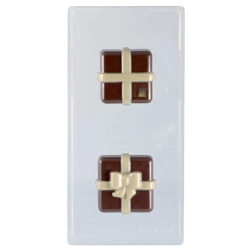 Molde de plástico termoformado diseñado para hacer un paquete de regalo navideño que se rellenará con pralinés y otras golosinas, perfecto para enriquecer las vitrinas de confiterías y chocolaterías.